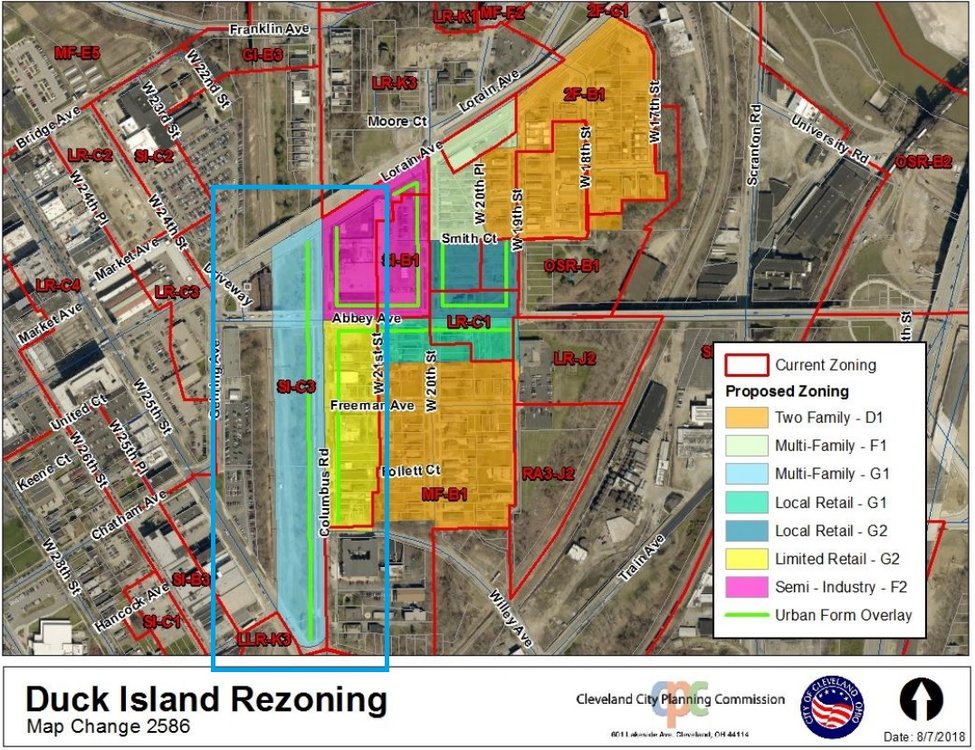 Cleveland City Council on Oct. 17 voted unanimously to rezone multiple parcels of land in the fast-growing Duck Island neighborhood (see map above). It followed the creation of a development masterplan based on public input. The land along the west side of Columbus Road, from Lorain to West 25th, was rezoned from semi-industry to “multi-family G-1” which allows a range of residential uses, from single-family homes to apartment buildings. The maximum square footage of a building on a property zoned G-1 is three times the lot area and can be up to 35 feet in height based on the street frontage. However, the Red Line right of way below Columbus Road is 25-30 feet lower.