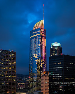 | A new SHW HQ tower could make a colorful state- ment. An example would be the Wilshire Grand Center in Los Angeles. At night, its LED strip can change colors for certain occasions (UrbanOhio). |