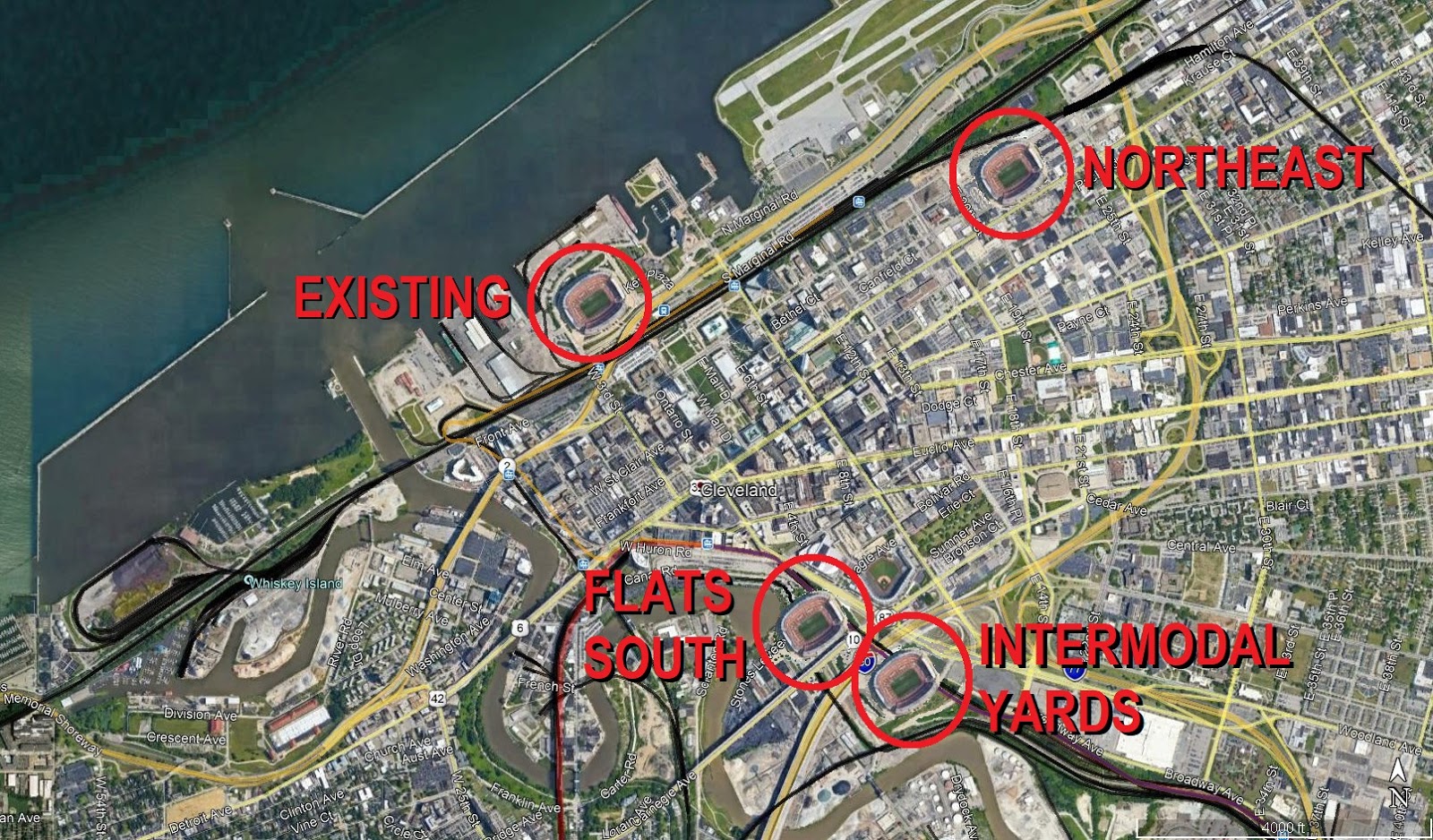 Similar opportunities exist in Cleveland. But where? So far, these are the sites that apparently are being considered by the Haslams, according to sources close to them, for their stadium-oriented development built around a domed/retractable-roof facility: