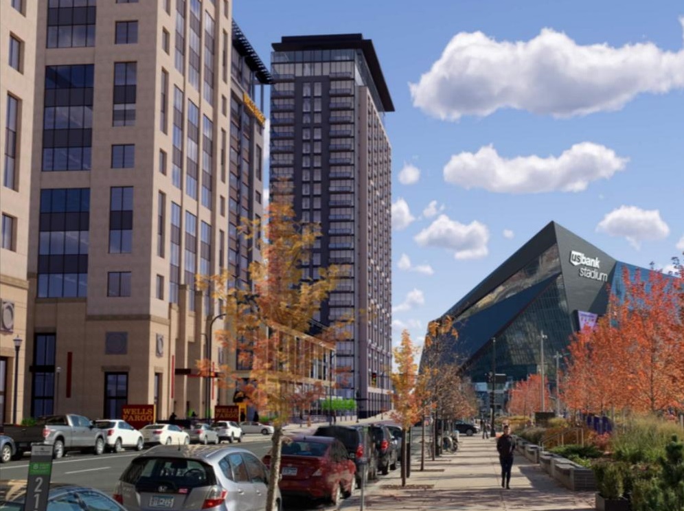| Another view of the stadium-area development zone located in Minneapolis, with new office buildings at left for Wells Fargo and a planned 25-story apartment tower beyond (Ryan Cos.). |