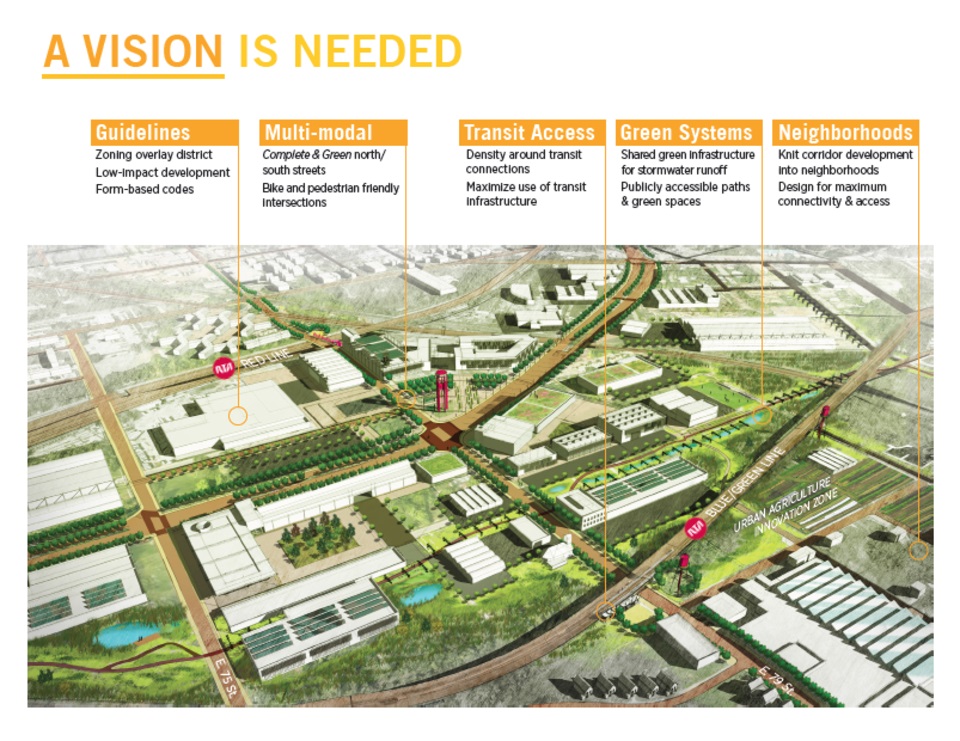 The goal for the Opportunity Corridor is to attract employers to hundreds of acres of newly cleared land that are accessible to the city’s under-employed residents. Also running through the Opportunity Corridor are high-frequency transit routes including all three of the region’s rail transit lines plus several bus routes that would help provide that access.