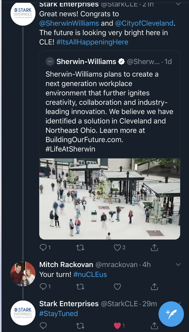 Stark Enterprises created new intrigue about nuCLEus Feb. 7 with a Twitter exchange instigated by Sherwin-Williams’ headquarters news. Stark Enterprises congratulated Cleveland’s 154-year-old corporate citizen and its hometown.