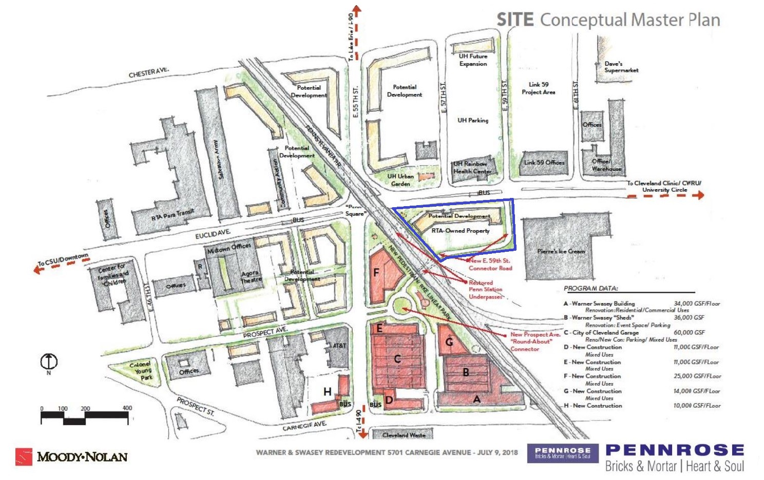 | This is a conceptual masterplan of the Penn Square area of Cleve- land’s Midtown. GCRTA’s property is outlined in blue (Pennrose). |
