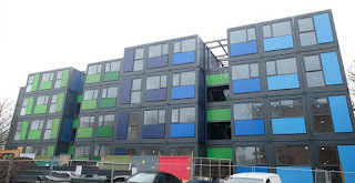 | An example of a four-story apartment building in London that was built from shipping containers (InvisiblePeople.tv). |