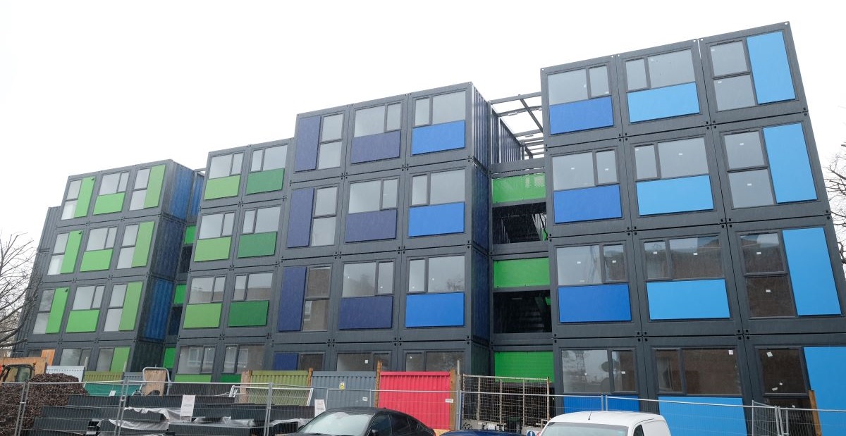 | An example of a four-story apartment building in London that was built from shipping containers (InvisiblePeople.tv). |