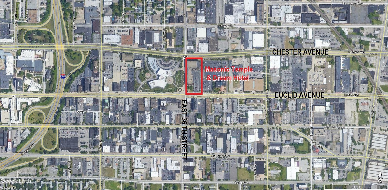 | Location of the existing Masonic Temple and proposed site of the Dream Hotel and TempleLive development (Google). |