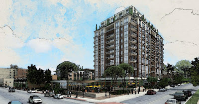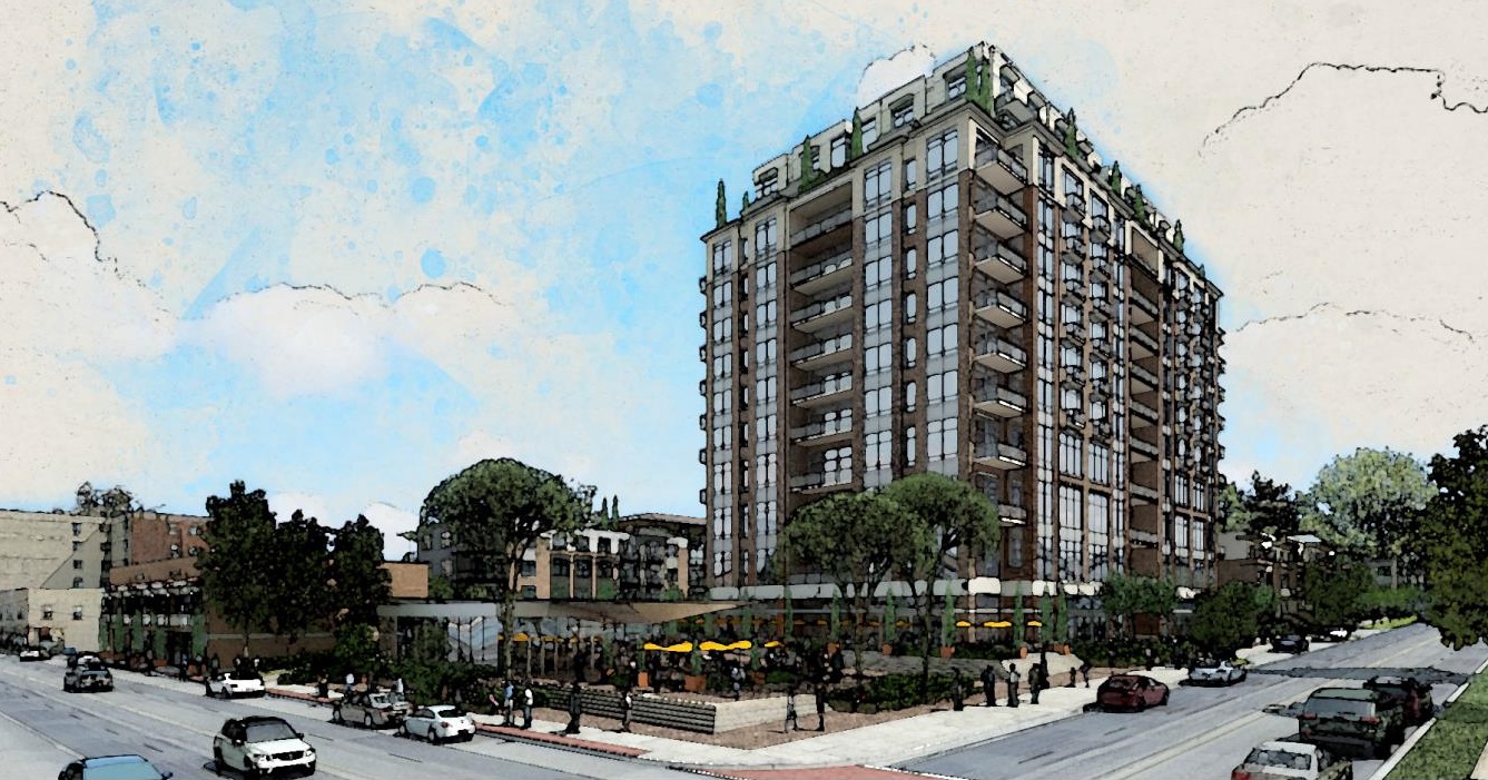 Their proposal centered around a public plaza, public lawn and a 12-story building containing eight stories of apartments over three stories of offices over ground-floor community center, plus retail or restaurants. The uses in that building would amount to 108 residential units, 50,265 square feet of offices and 11,400 square feet of usable ground-floor space.