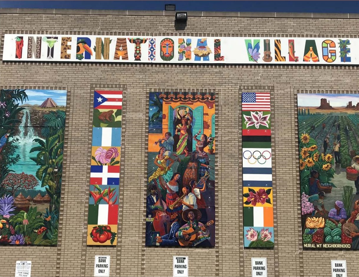| The International Village mural on the west wall of the City Bank Building at Clark Avenue and West 25th Street (OHFA). |