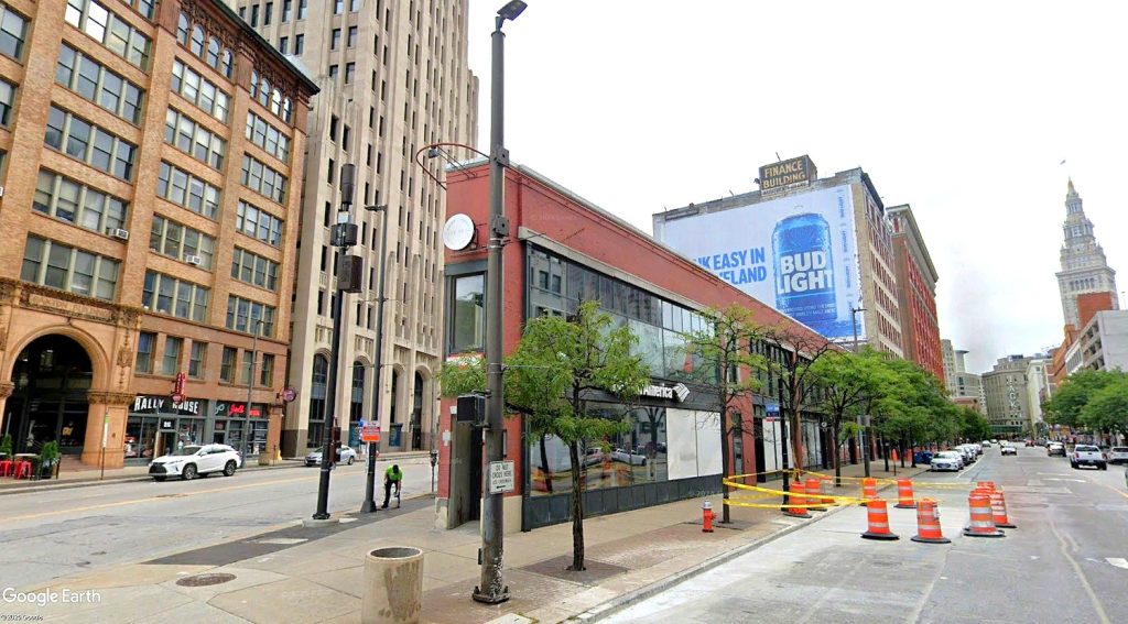 The two-story Flatiron Building once housed the Winking Lizard restaurant and second-floor Kent State University Cleveland Urban Design Collaborative offices but now is vacant except for the Bank of America branch. The building will be renovated for an Urban Meyer’s Pint House in the former Winking Lizard space and the second-floor offices will be updated (Google).
