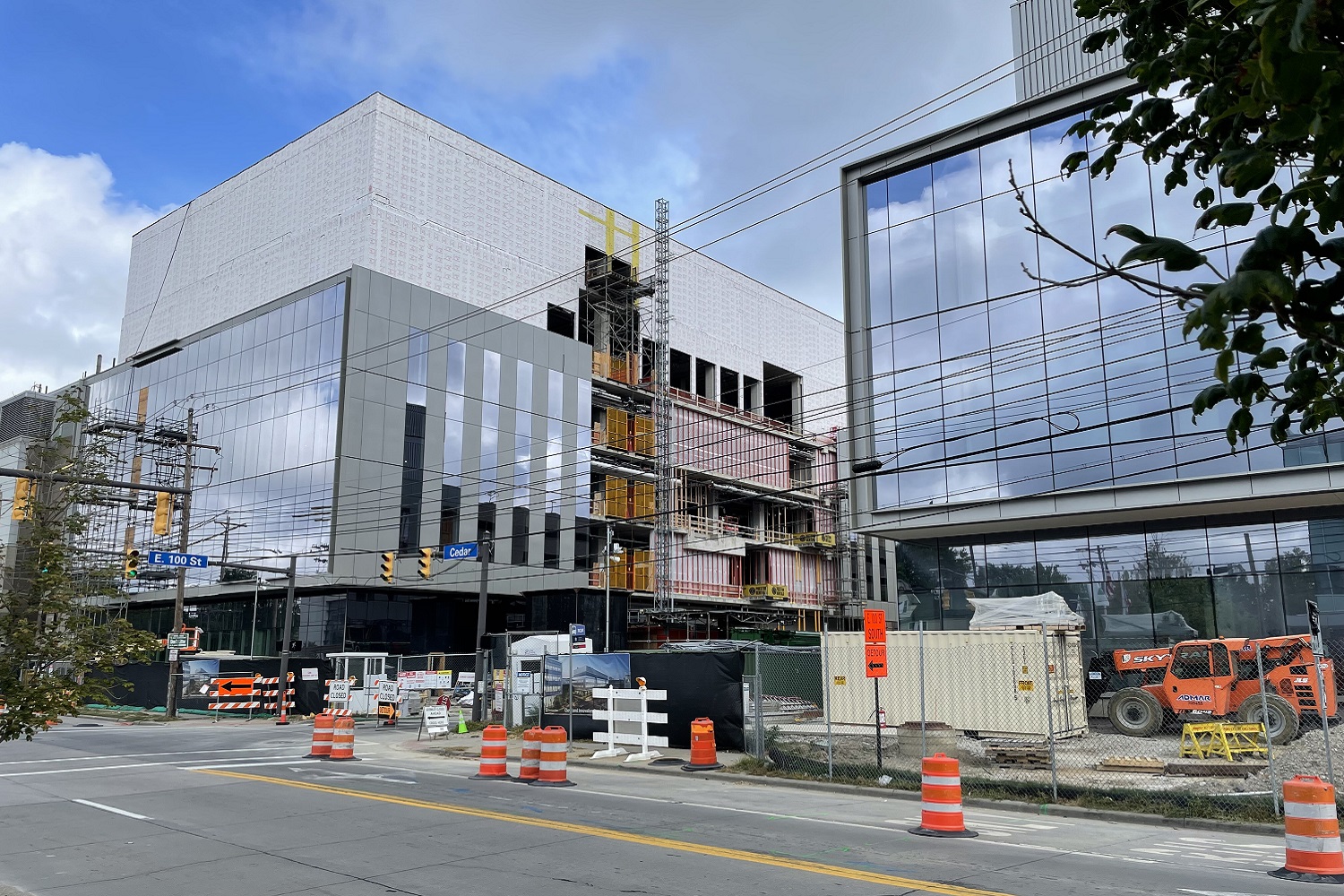 The northwest building, west of East 100th, will be approximately 120,000 square feet, designed for specialty research facilities and core services. Construction on both buildings began in February 2023 with anticipated completions in November 2025 for the northeast building and March 2026 for the northwest building.