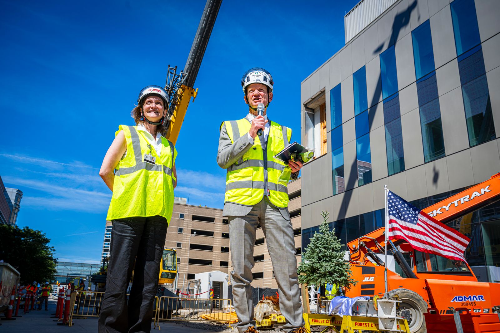 At left, Serpil Erzurum, Cleveland Clinic’s chief research and academic officer, and Bill Peacock, the Clinic’s chief of operations, addressed health care system staff and project construction workers moments before the final steel beam was lifted into place. It was for the enclosed walkway, to be fitted into the opening in the building to the right of Peacock (Cleveland Clinic).