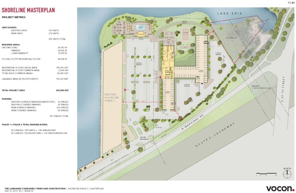 In 2019, Landmark Companies’ proposed new apartment building was to be built all in one phase, the same as The Annex Group is seeking to do now. But since there could be a different property owner, the sharing of parking between the new Union At Cleveland Harbor and the existing Shoreline Apartments, at left, probably wouldn’t happen (Vocon).