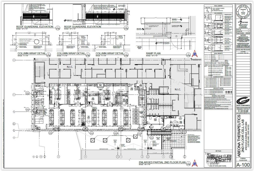 Floor plan for Abeona Therapeutics’ cell lab on the southwest corner of the second floor of the Midtown Tech Park, Building One. Abeona also has just north of it on the second floor (Geis).