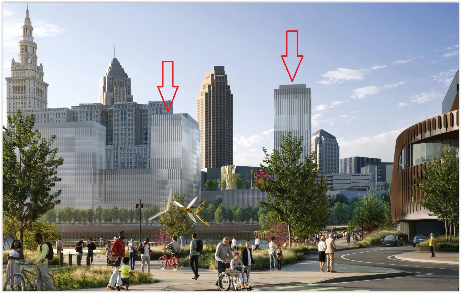 As they say in target practice, “pay attention to the background.” That’s also good advice to use when reviewing plans for major urban developments like Bedrock’s Riverfront Cleveland masterplan. But the plans, in this case renderings, opened the door to inquire about Bedrock’s vision for another downtown megaproject.
