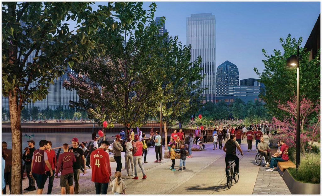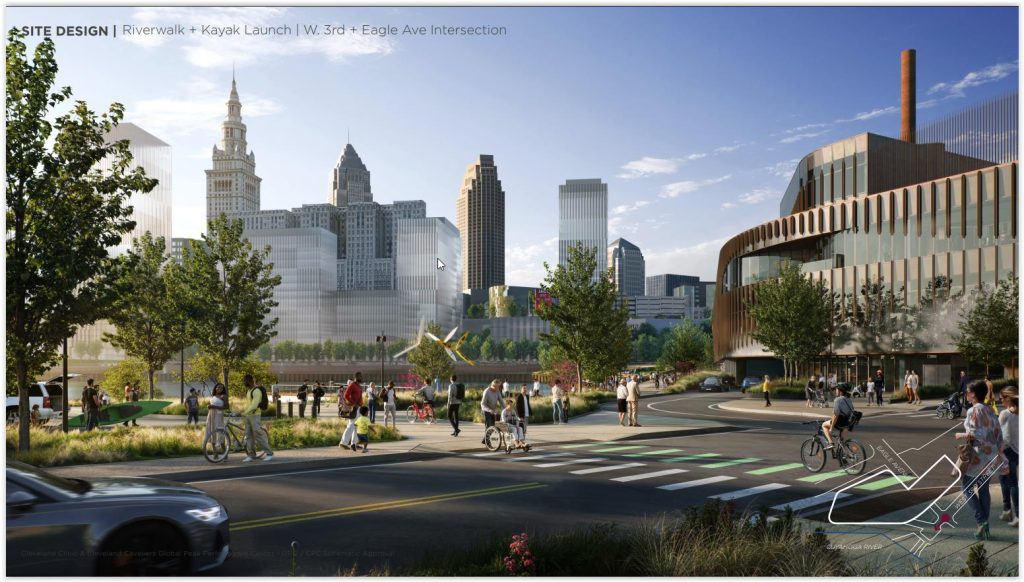 At the latest meeting of the Design Review Committee of Cleveland’s Planning Commission, final site and lighting plans were approved for public realm improvements — riverwalk, kayak launch, streetscaping — next to the under-construction Cleveland Clinic Global Peak Performance Center.