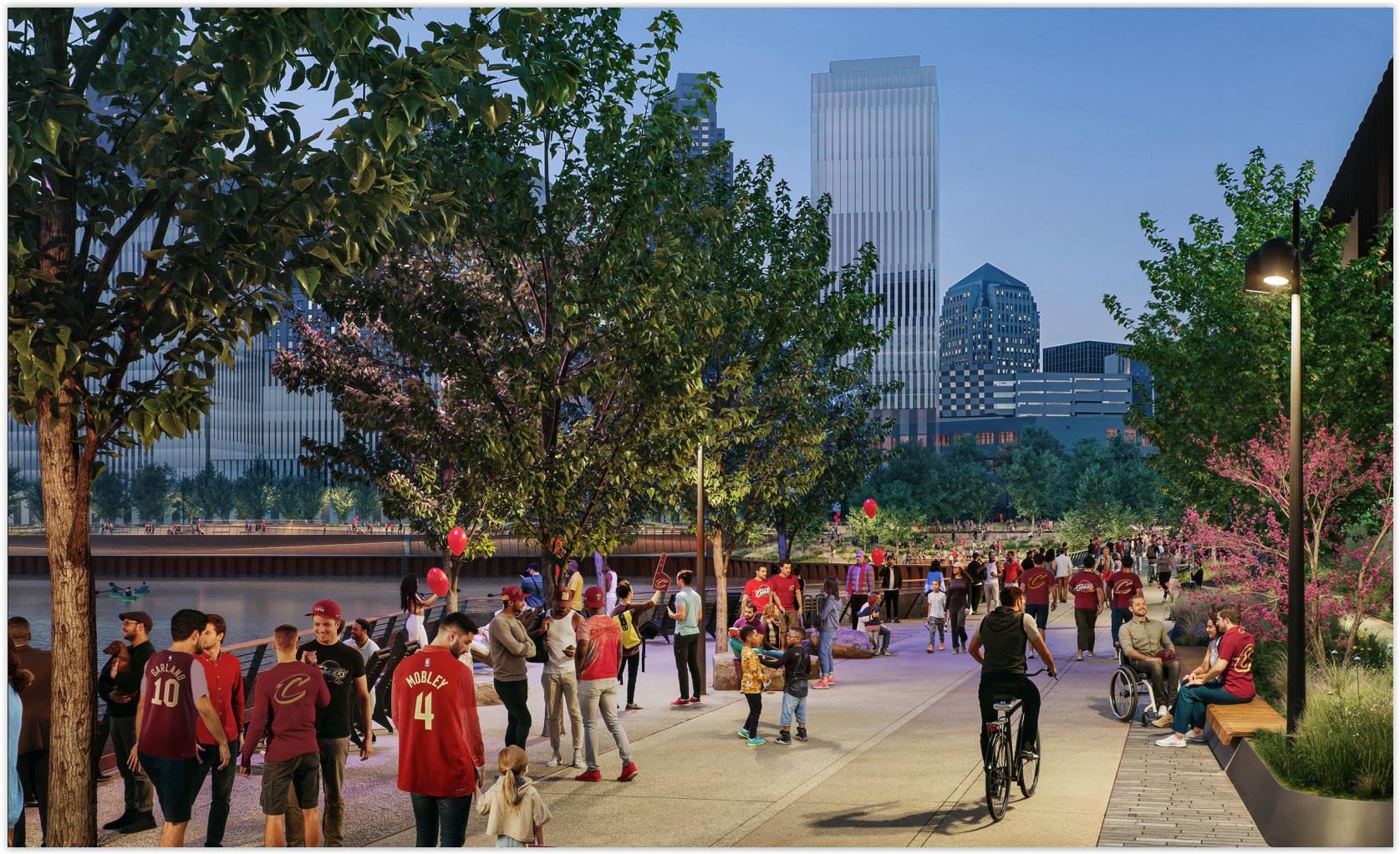 Zooming in on a rendering of Bedrock’s Riverfront Cleveland public realm improvements, the view from West 3rd Street and Eagle Avenue in the Flats reveals massings for new downtown towers in Bedrock’s Rock Block, right, and the next phases of its Riverfront development at left (MKSK). CLICK IMAGES TO ENLARGE THEM.