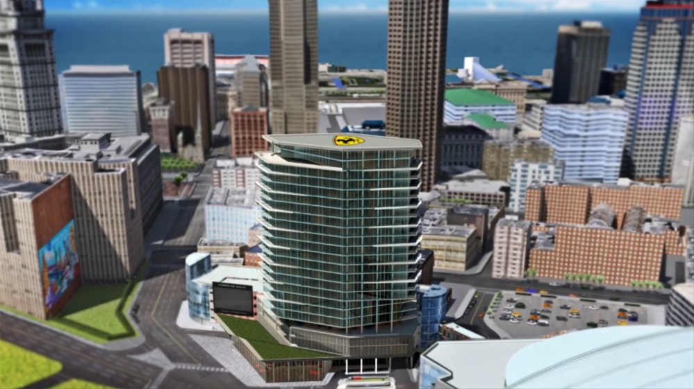 NEOtrans reached out to Bedrock’s Vice President of Communications Lora Brand to find out more about them. She responded after the original article was published and said one of the towers with the cone top in the background is supposed to represent the Fifth Third Tower. It was the only correction she offered to this article.