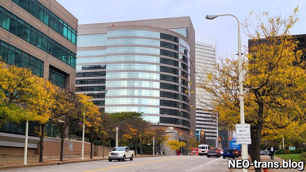 The curving northern façade of The Bell is probably its most distinctive feature. Its windows offer views of Downtown Cleveland’s lakefront and Lake Erie (NEOtrans).