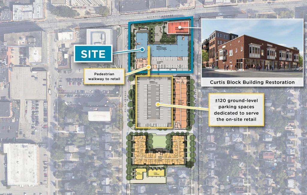 Planned for Lakewood Common, 14519 Detroit Ave., are 293 multifamily housing units, 30,000 square feet of ground-floor retail/office space, a 536-space parking garage, 31 ground-floor parking spaces in a mixed-use building, renovation of the historic Curtis Block and a new public plaza on Detroit at Belle.