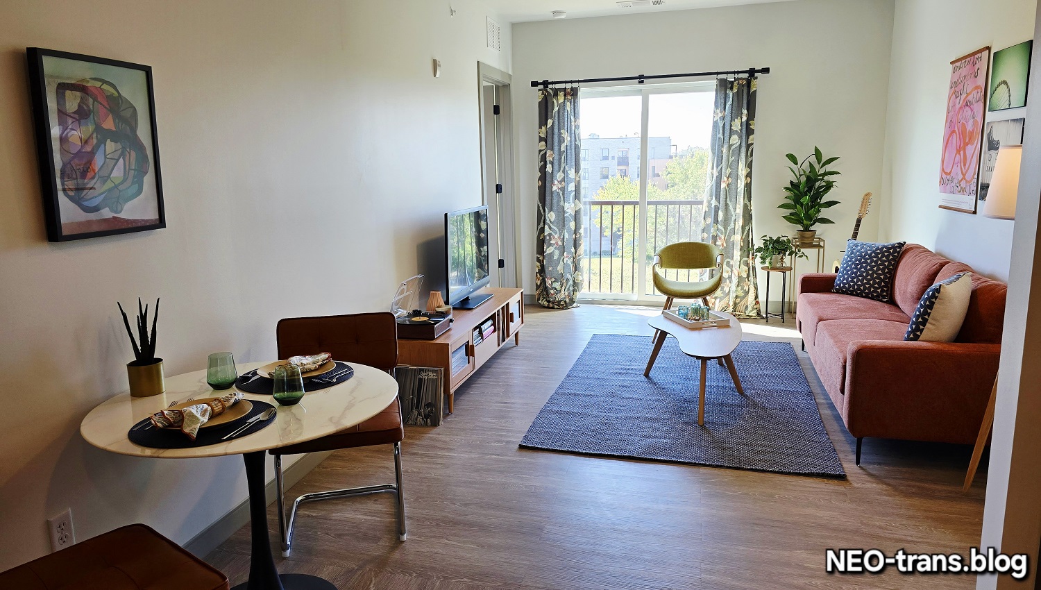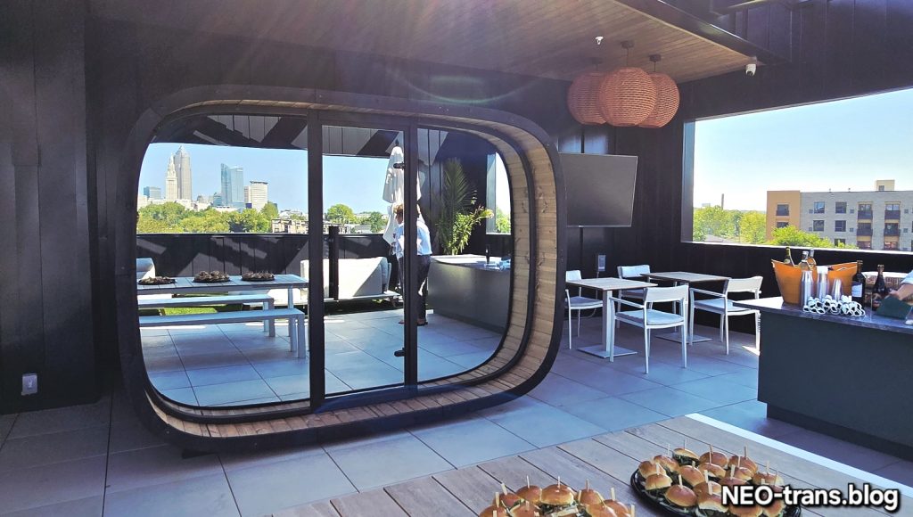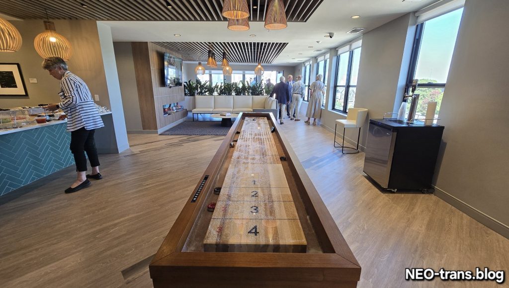 The highlight of a tour is the amenity-laden community room and outdoor deck on the top floor of the north wing. Its view of downtown is unobstructed and likely to stay that way because the view is across the wide valleys for Walworth Run and the Cuyahoga River. This common space has a lending library, outdoor sauna, TVs, and beer tap.