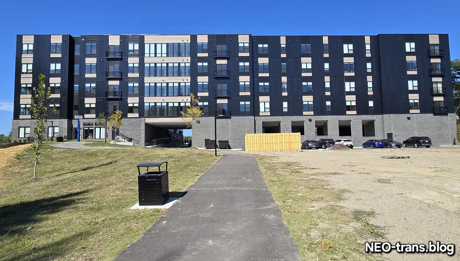 Although some finishing touches are still coming, The Park in Cleveland’s Tremont is welcoming its first tenants in a setting that offers 1.5 acres of green space featuring walking paths, native landscaping and amazing views of Downtown Cleveland. This is one half of the L-shaped building. Plus, a second phase with for-sale townhomes could someday rise on the land to the right (NEOtrans). CLICK IMAGES TO ENLARGE THEM.
