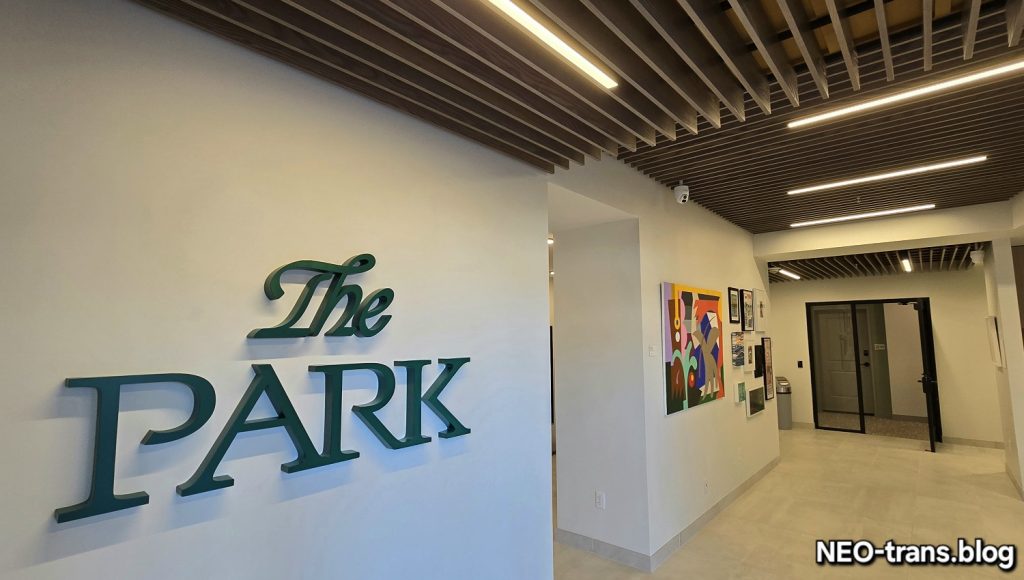 The Park has an L-shaped footprint with a lobby and a talking elevator at the corner where the two wings meet. The lobby has a glassy leasing office on one side and a mail/packages room on the other. There is also a kitchen and coffee bar in the lobby, with furniture still to be delivered.