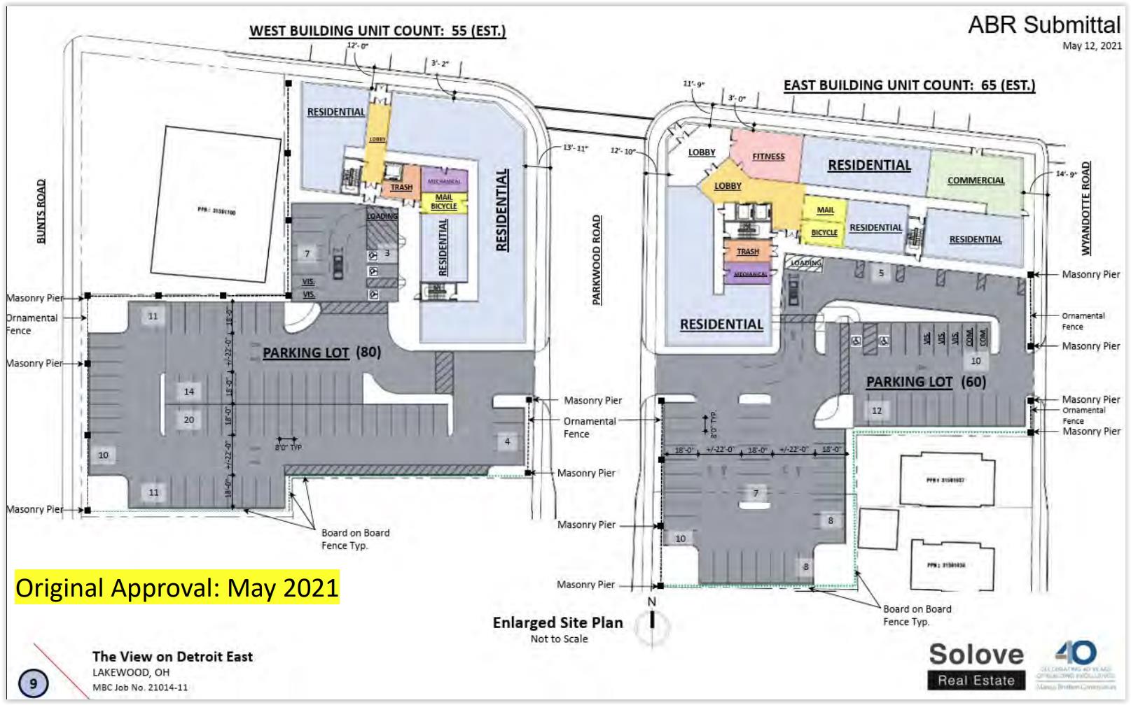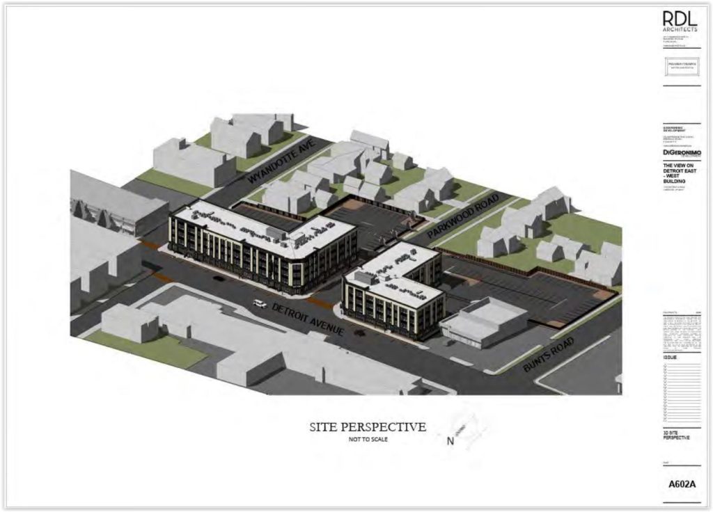 As before, 65 apartments are planned in the east building, between Wyandotte and Parkwood avenues with a ground-floor, leasable commercial space at the corner of Detroit and Wyandotte. In the west building, west of Parkwood, 55 apartments are planned. A total of 110 units and 140 off-street parking spaces are sought.