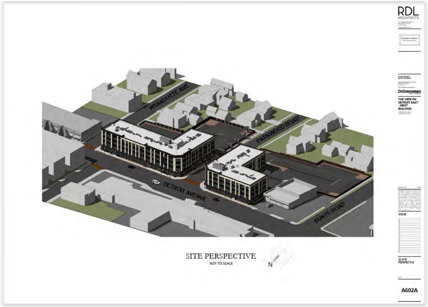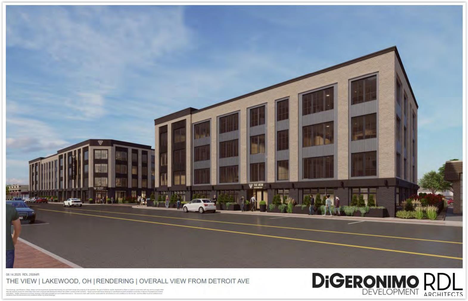 It’s back! Solove Real Estate’s The View on Detroit’s mixed-use development has a new project leader. DiGeronimo Companies is seeking to build a project very similar to what Solove proposed four years ago on Detroit Avenue just east of Bunts Road. It is just one of four current and planned large developments on Detroit in Lakewood (RDL). CLICK IMAGES TO ENLARGE THEM.