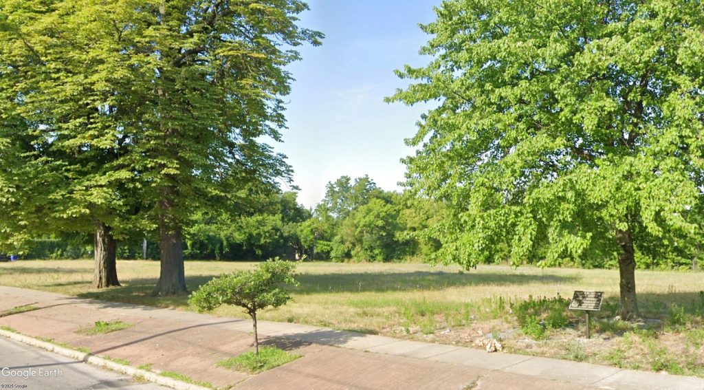 Three trees remain at the Lakeview Avenue side of the former school site including two mature trees at left and another tree planted three decades ago after a kindergartner was shot and killed in a drive-by shooting. Chadey Anderson, Rev. Bruce Klunder who died during a civil rights protest in 1964 and school administrator Stephen E. Howe are named on the plaque next to the tree planted in their memories (Google).