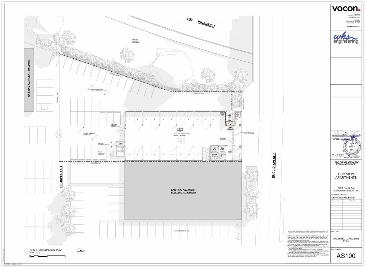The next aging office building in Cleveland’s urban core that’s proposed to be converted to residential is near the intersection of Euclid Avenue and East 30th Street. Because of the adjacent Innerbelt highway, this building has a clear view of Downtown Cleveland (Vocon). CLICK IMAGES TO ENLARGE THEM.