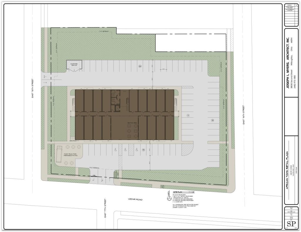 This conceptual site plan for the African Town Retail Plaza features 61 parking spaces around the perimeter of the building whereas 41 spaces are required. Despite having extra parking, the site also has enough room for a food truck park at the southeast corner of Cedar Avenue and East 78th Street. North is at the bottom of this image (JL Myers).