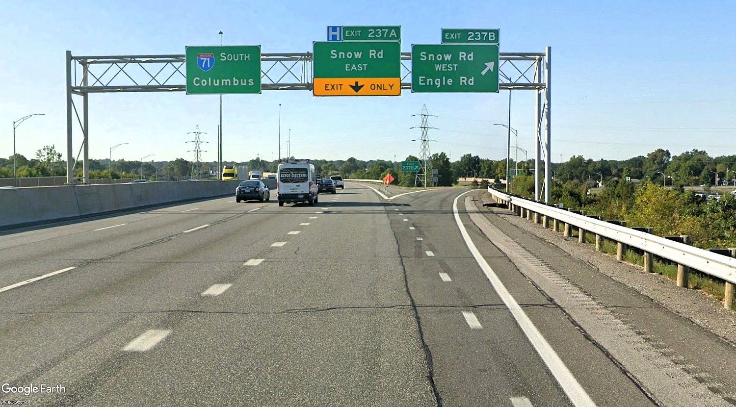 2 — I-71 SB-Snow/Flyover Ramp — This includes a proposed I-71 southbound (SB) slip ramp to Engle Road southbound with the elimination of the northbound movement over the CSX tracks, WB Snow Road slip ramp to Engle southbound, and a new I-71 SB exit ramp flyover bridge to Ring Road (currently Five Points Road/State Route 291 linking Engle to Henry Ford Boulevard.