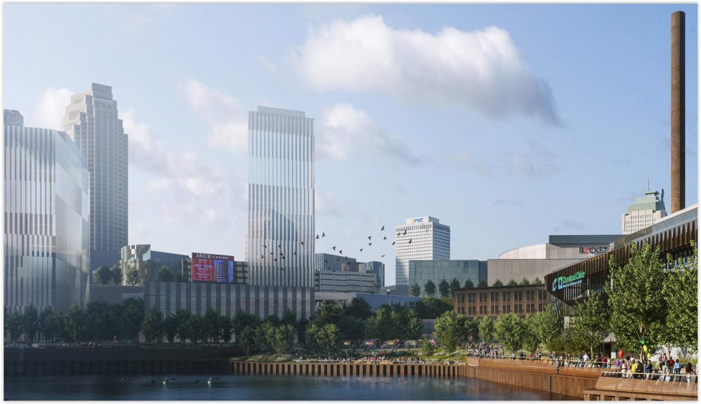 When asked by NEOtrans about recent tower massings in the background of its Riverfront Cleveland development, Bedrock’s Vice President of Communications Lora Brand said that none are associated with the Rock Block.