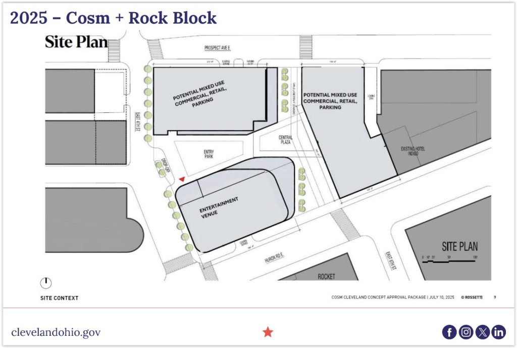 The site preparation for Cosm represents a big step forward for the Gateway District parking crater which was previously owned by Stark Enterprises. It planned a lofty development called nuCLEus for the site but was unable to realize it. Stark sold the property to Bedrock in 2023 for $26.5 million.