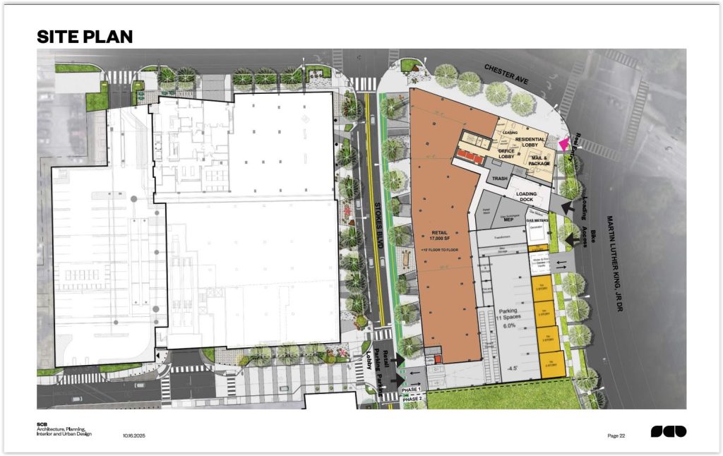 It is planned to fill half of a block on Chester Avenue between Stokes Boulevard and Martin Luther King (MLK) Jr. Drive. The skyscraper’s ground floor will have 17,000 square feet of retail space. Above that will be a roughly 300-space parking garage, to be hidden someday by a phase 1B offering of up to five for-sale townhomes along MLK.