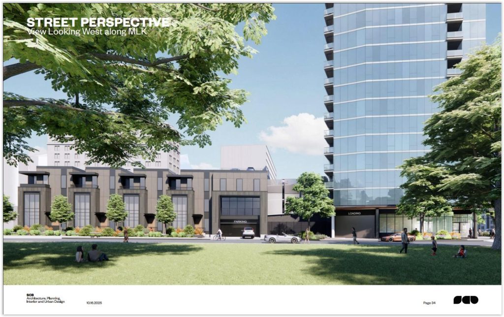 Plans for the tower show its lobby will be the at the northeast corner, at Chester and MLK. South of the lobby on the MLK side, up to five townhouses are planned but are not a part of this phase.