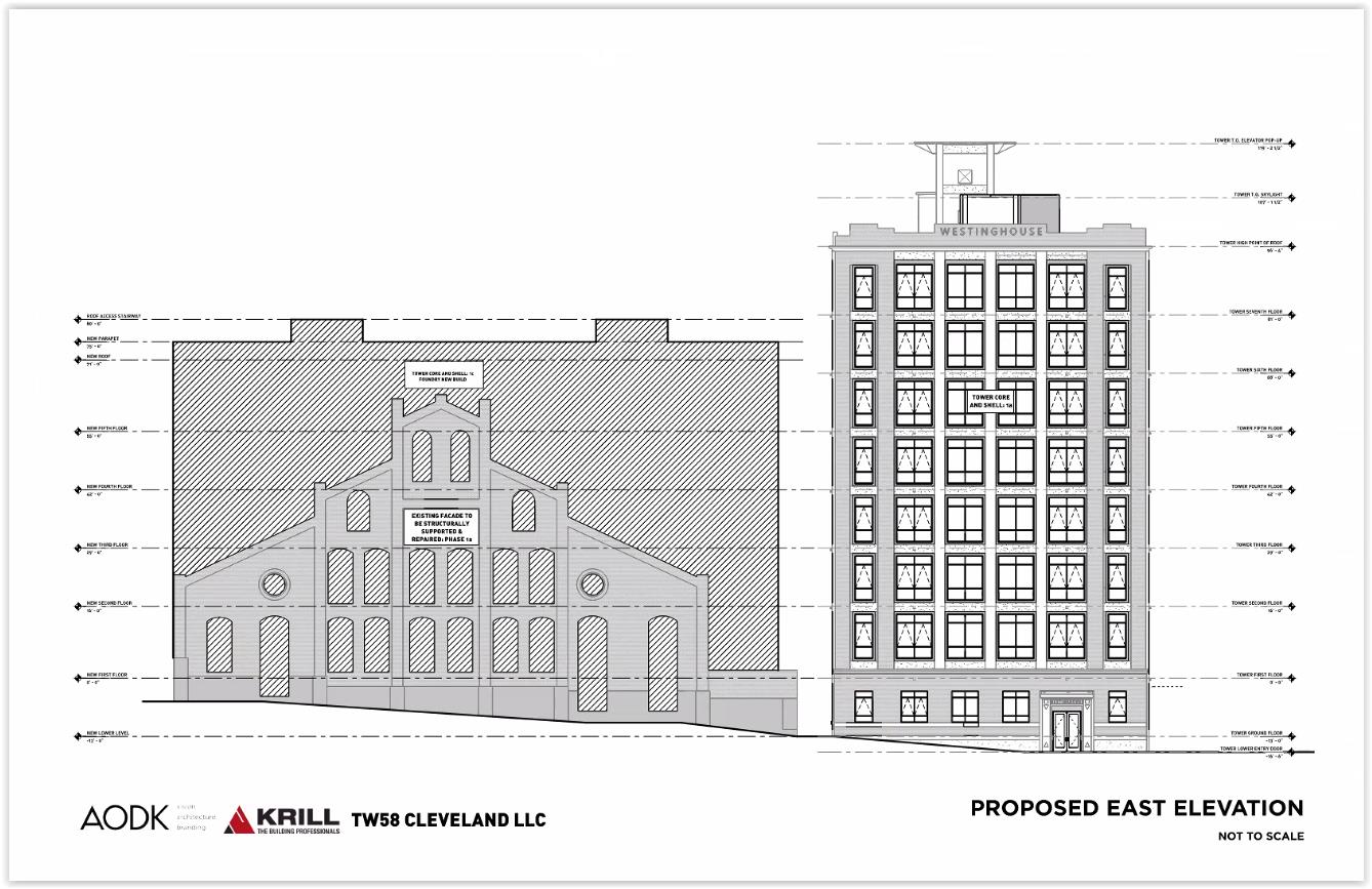 Phase 1A of the Westinghouse redevelopment is comprised of enclosing and renovating the existing core and shell of the 113,680-square-foot historic tower at 1200 W. 58th St. in Cleveland’s Gordon Square neighborhood. The 1915-built, eight-story, 136-foot-tall tower saw interior demolition work done in 2023, gutting the tower to its core and shell.
