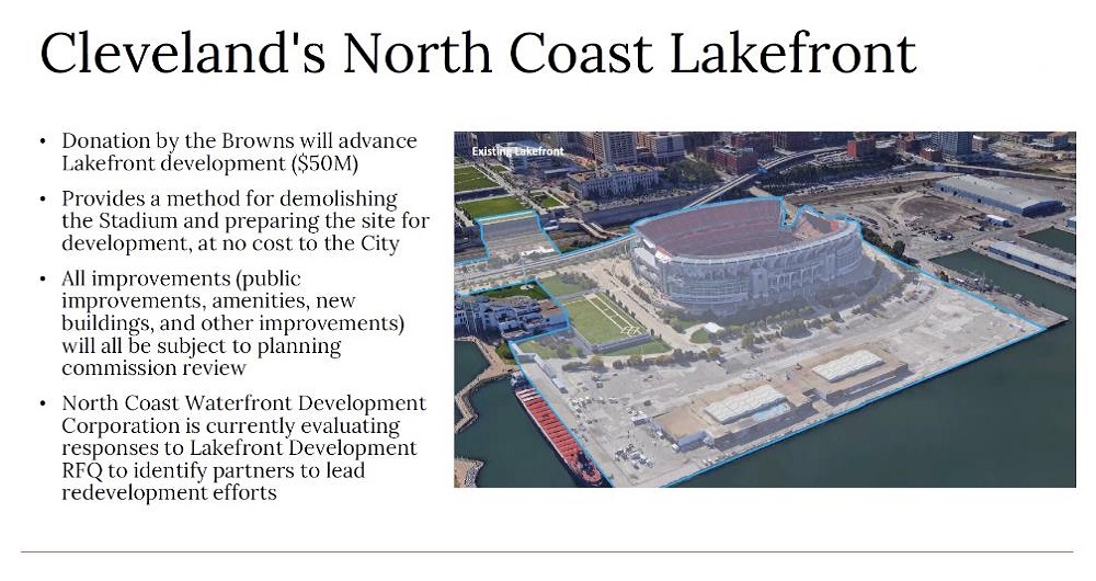 It also would achieve the demolition of the city-owned Huntington Bank Field where the Browns play their homes games, yet allow the Browns to stay for two years beyond the end of their lease if there are construction delays in Brook Park, a story first broken by NEOtrans.