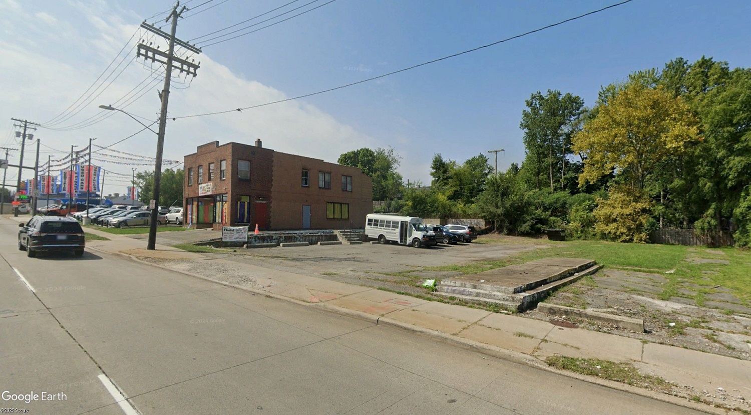 Looking generally south on West 117th Street, the site on which the car dealership is to be expanded is seen here. That includes demolishing the two-story, century-old brick building containing the Tiny Caterpillars Childcare Center. The land at right had a single-story retail building on it until just after 2000 (Google).