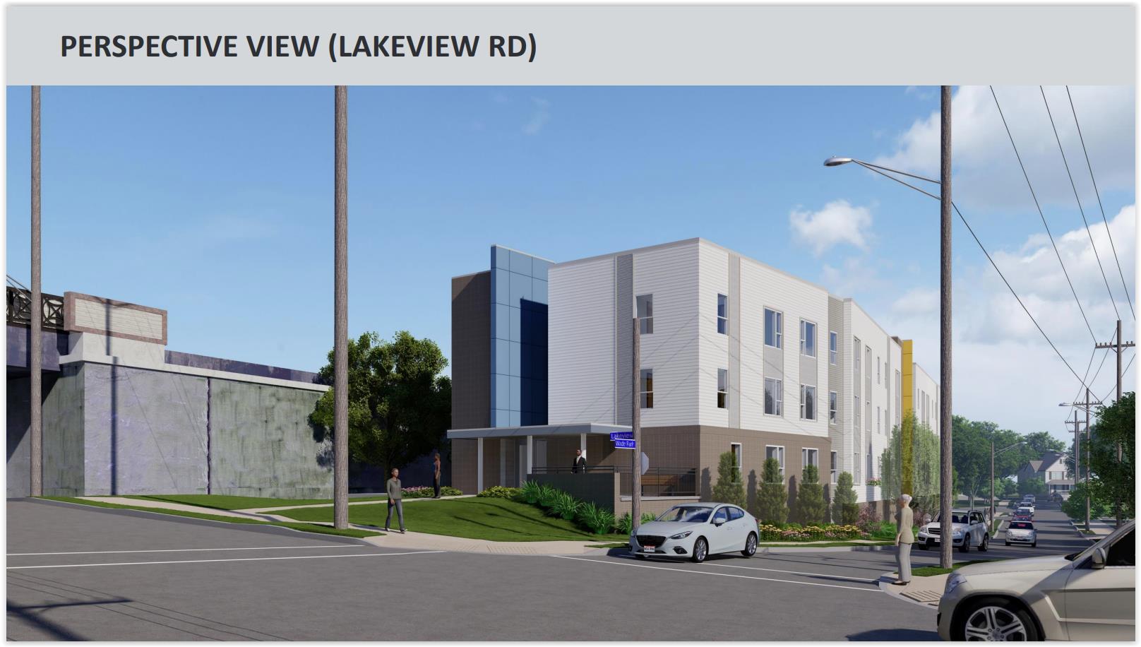 The result would be a building that’s three stories tall at the Lakeview end and four stories at the southwest end. The prior, conceptual plan envisioned the building being entirely three stories tall.