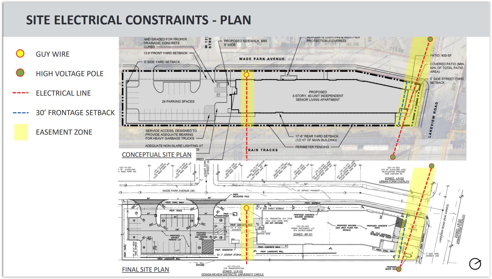 The two electrical wires were high-voltage power lines, one belonging to Cleveland Public Power and the other to First Energy. Worse, one had a 20-foot-wide property easement below it and the other a 36-foot-wide easement on which no structure could be built.
