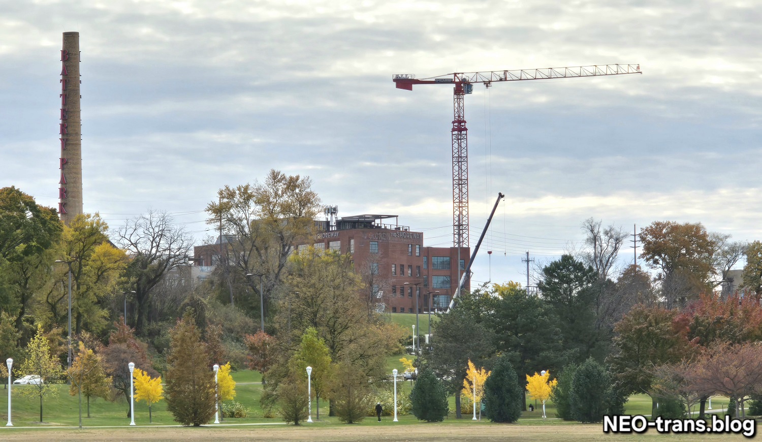 The Battery Park chimney is also as tall as the tower crane for the new Shoreway apartment tower. Both stand out atop Edgewater Park which is awash in late-autumn colors (NEOtrans).