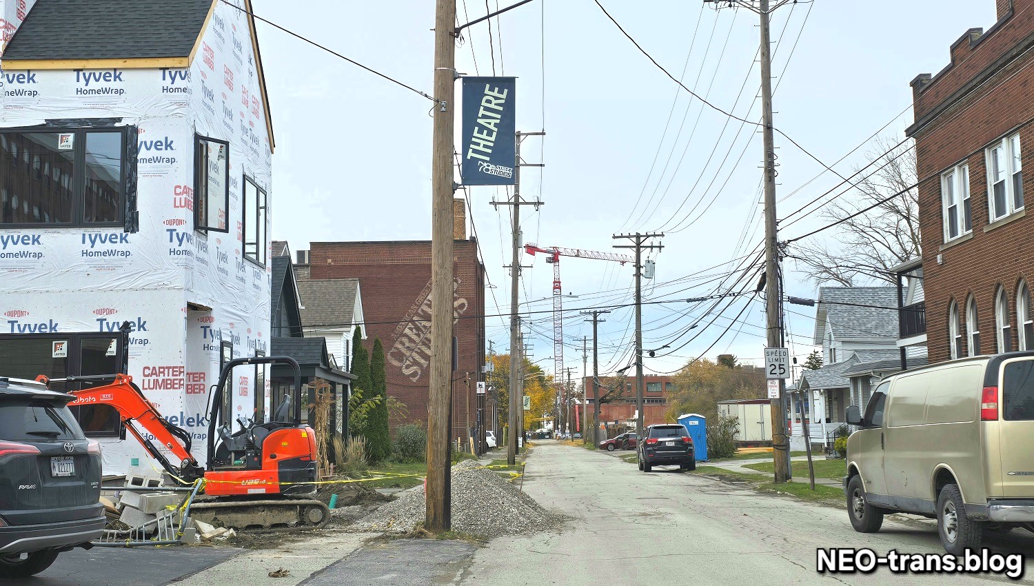 From the south, the tower crane can sometimes be seen between buildings or, in this case, at the end of West 78th Street where new infill housing is also adding to the Detroit-Shoreway neighborhood’s residential inventory (NEOtrans).