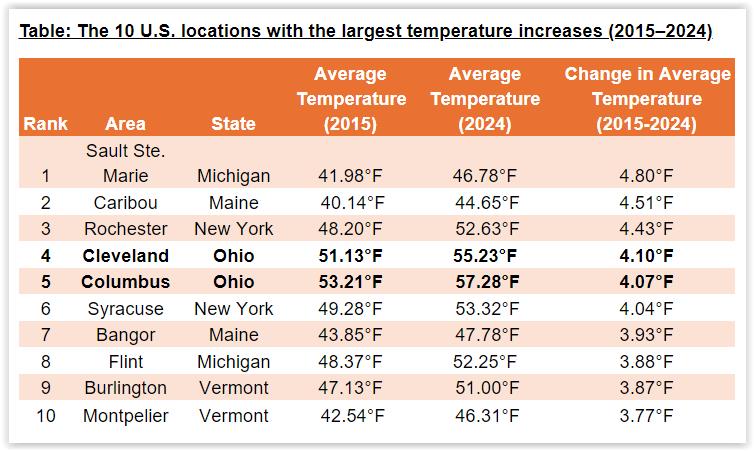 Cleveland and Columbus both ranked in the top-10 U.S. cities experiencing the largest temperature increases over the past 10 years (NCEI, Anderson Air).