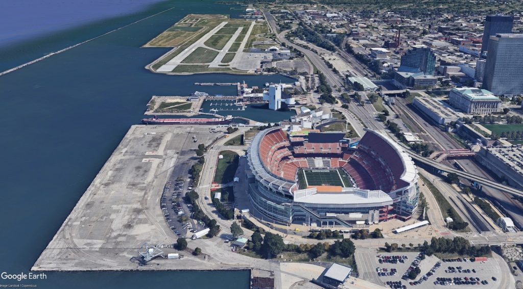 This eastward-looking view shows the location in the foreground of the proposed Downtown Cleveland lakefront redevelopment site in relation to the runways and western flight path to/from Burke Lakefront Airport in the background. Huntington Bank Field is not in the flight path for Burke and thus there are no height restrictions for any future development that replaces the stadium. North or left of the stadium, there are restrictions that rise toward the west (Google).