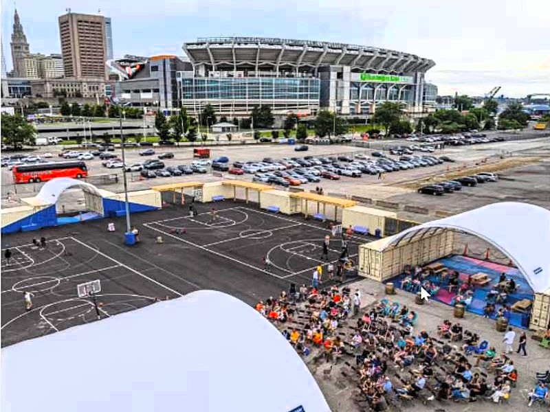 The North Coast Yard is a pop-up park created on city-owned lakefront land, north of Huntington Bank Field and next to the Steamship William G. Mather Museum. Although temporary, its recreational uses are the types of public-space programming that can be expected in a redevelopment of Downtown Cleveland’s lakefront after the stadium is demolished (NCWDC). CLICK IMAGES TO ENLARGE THEM.