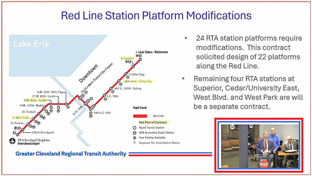 The Operational Planning & Infrastructure Committee recommended hiring primary contractor Schirmer Construction LLC and a subcontractor Forest City Erectors for $11.1 million to retrofit 22 platforms at 14 stations along the 18-mile Airport-Downtown-Windermere Red Line, said Donald Tereba, GCRTA’s engineer and project manager of facilities.