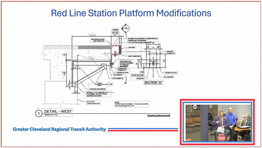 A view of how the station platforms will be widened with a supportive bracket, composite strip and other materials. All of the materials except for the composite strip, highlighted in red, will be added with the existing trains running. The composite block that widens the platforms will be added during two tentative two-week shutdowns of the Red Line east and west of downtown (GCRTA).