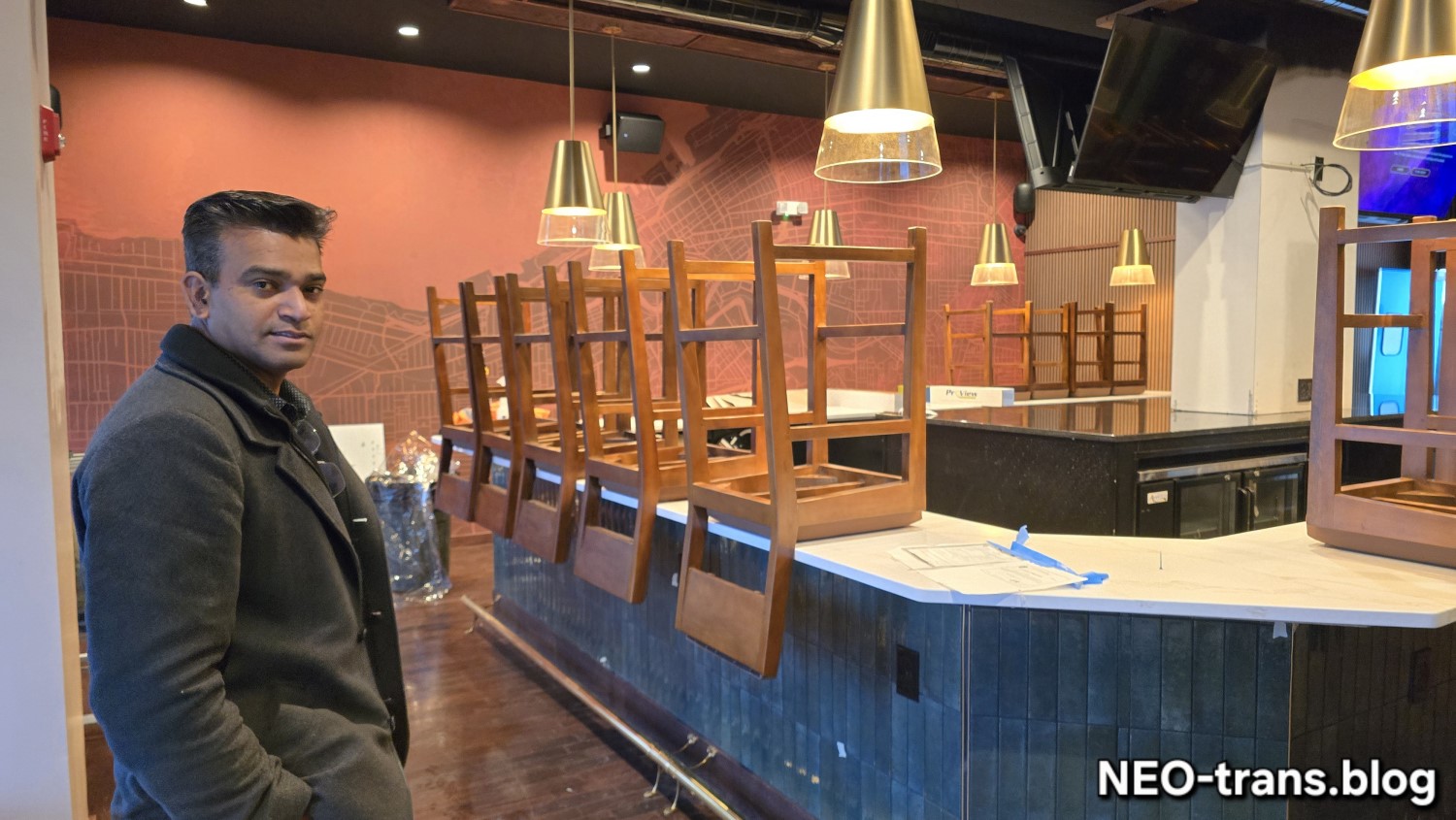 Saravanan “Babu” Chandrababu oversees renovations to the former Tick Tock Tavern that will convert it into Safar and open at the end of this month. With a Cleveland-Lakewood map mural in the background, the Legacy bar shown here will offer traditional American foods while two other rooms will offer a fusion of Indian foods in a fine-dining and speakeasy lounge setting (NEOtrans). CLICK IMAGES TO ENLARGE THEM.