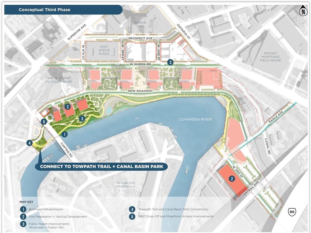 The evolving vision for the Riverfront below Tower City Center is outlined here from east to west, which is also how Bedrock anticipates the chronology of development here. It’s a chronology that Bedrock and Rock Entertainment executives anticipated completing in phases over two to three decades. They now believe they can deliver it within 5-10 years.